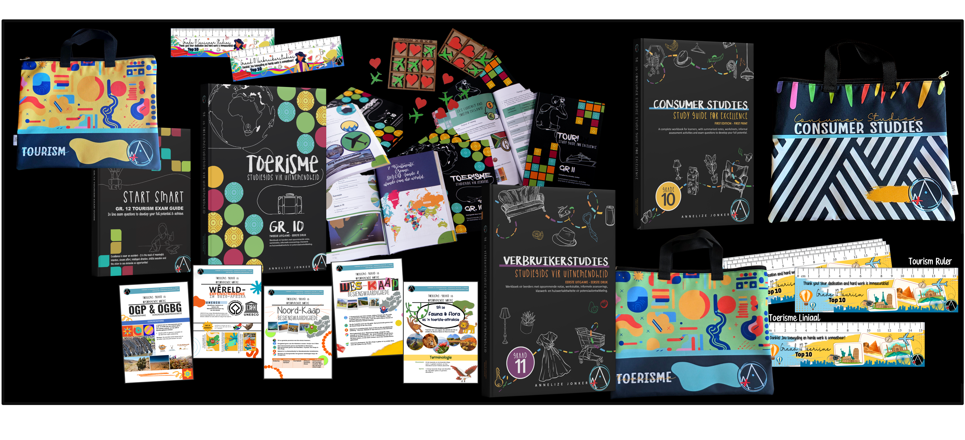 Used and trusted by learners, teachers and schools all over South-Africa Embrace this opportunity to place your orders for all your learning & teaching requirements as we offer a wide variety of study material for Gr 10 - 12 Consumer Studies & Tourism in both Afrikaans & English. The full-colour study guides cover the entire year's CAPS-syllabus, and include worksheets, possible exam questions and informal assessment activities. The full package also includes PowerPoint presentations, assessment tasks & summarised notes!